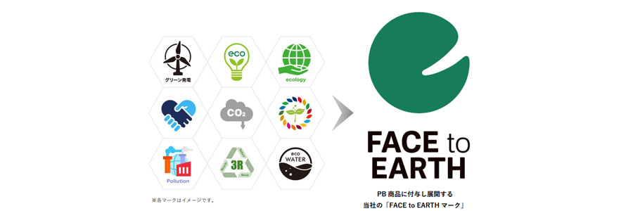 お客様へ本指針の基準を満たした製品であることをわかりやすくお伝えするために、当社グループ独自の環境配慮ロゴマーク「FACE to EARTHマーク」をPB商品に付与し、展開を開始します。