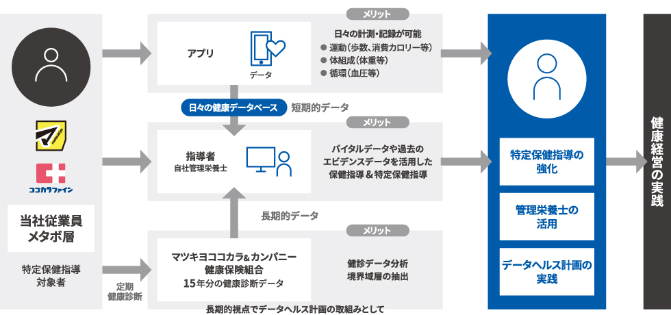 社内管理栄養士の育成と従業員の健康維持を目的として、健康保険組合より特定保健指導を受託した社内管理栄養士が、対象者の測定データや健康保険組合の各種データを活用した保健指導を実施しています。管理栄養士が約600名在籍する当社の強みを活かした特定保健指導プログラムの実施により、従業員の健康を食事、栄養面からサポートしています。